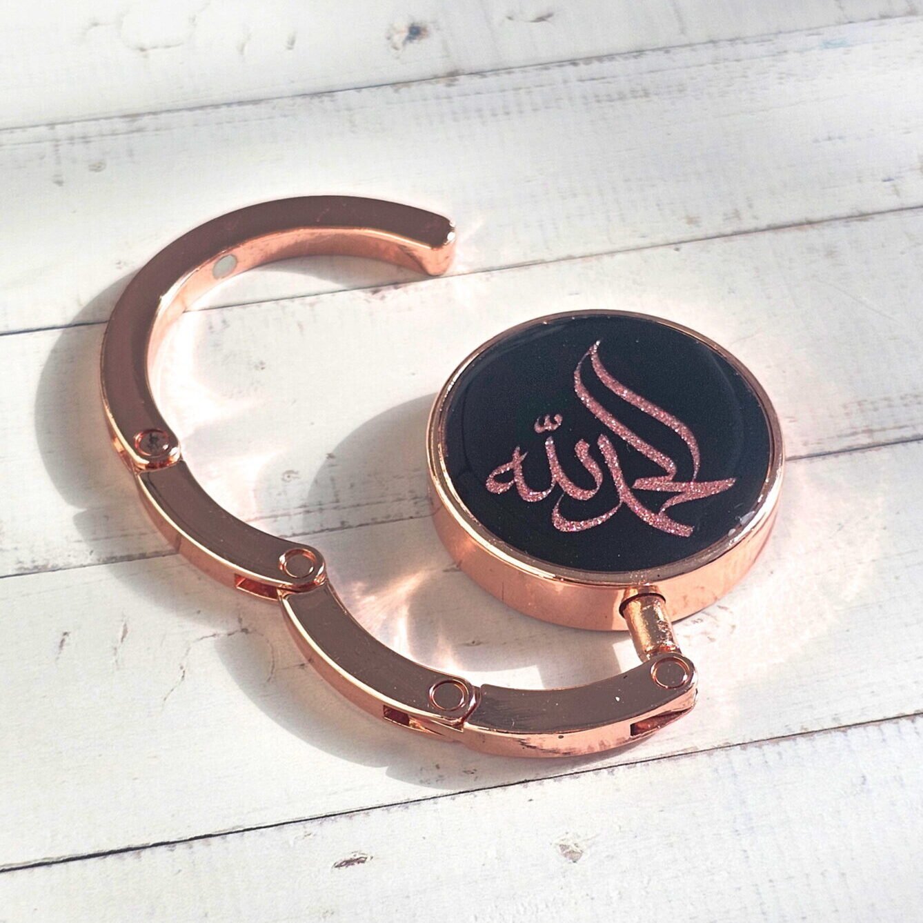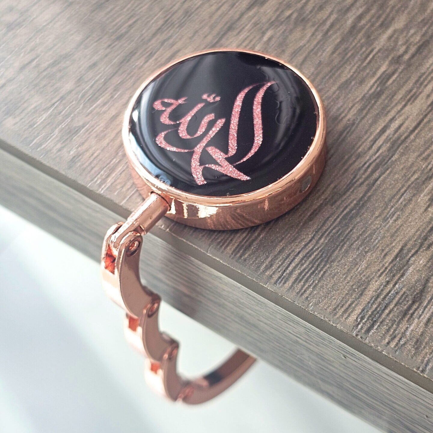 A foldable bag hook designed to keep handbags clean and within reach. Features Alhamdulillah calligraphy, with a refined everyday finish. Ideal for daily use or thoughtful gifting.