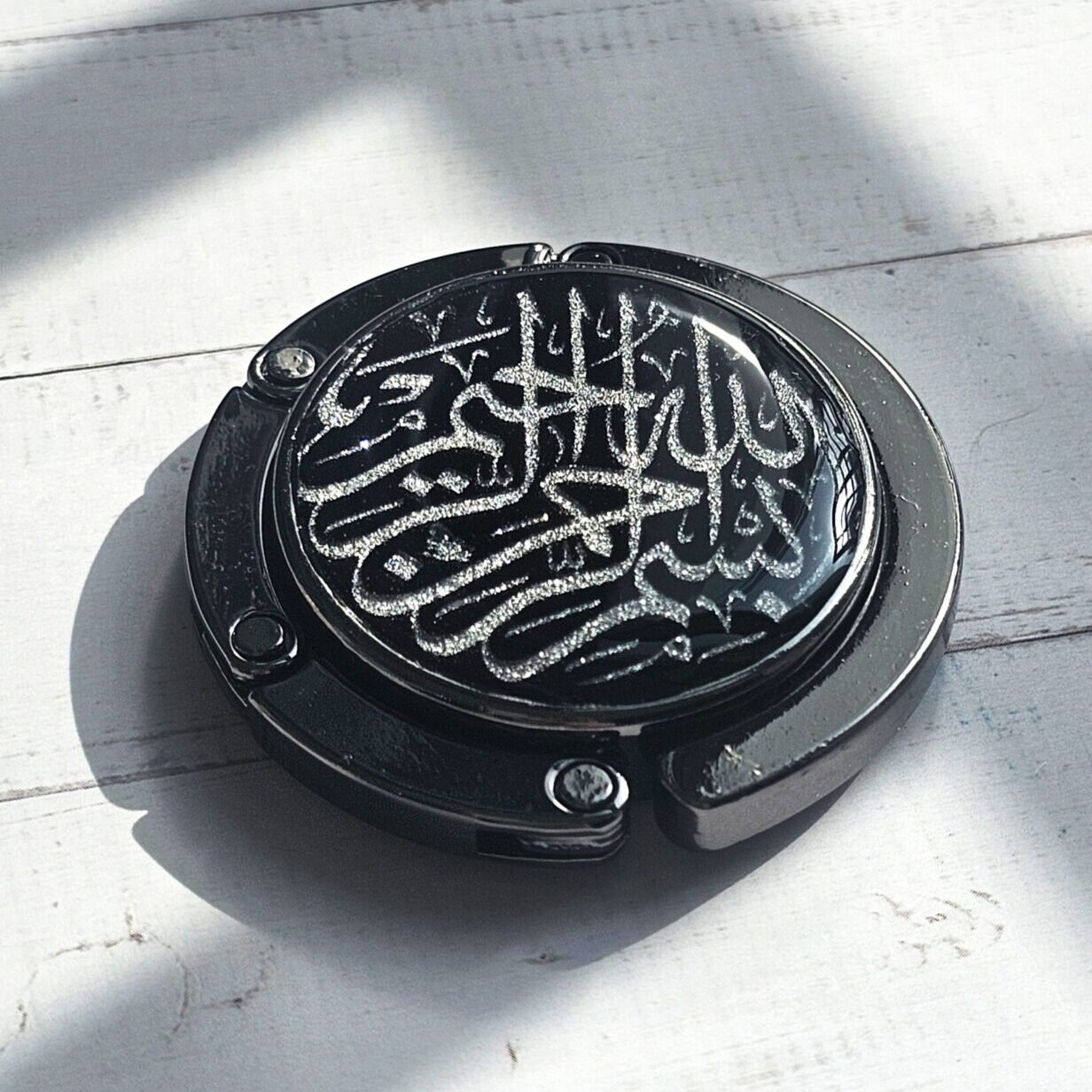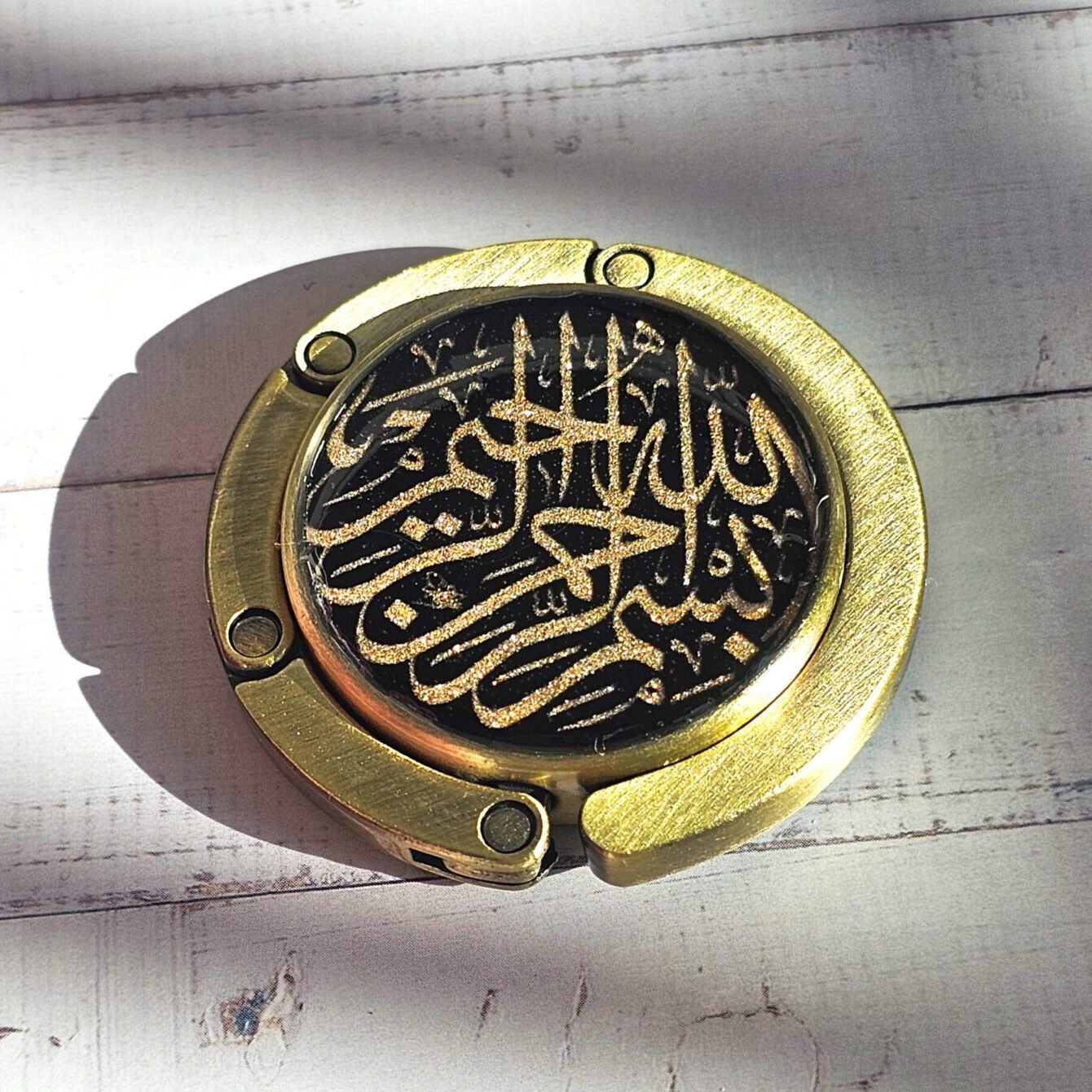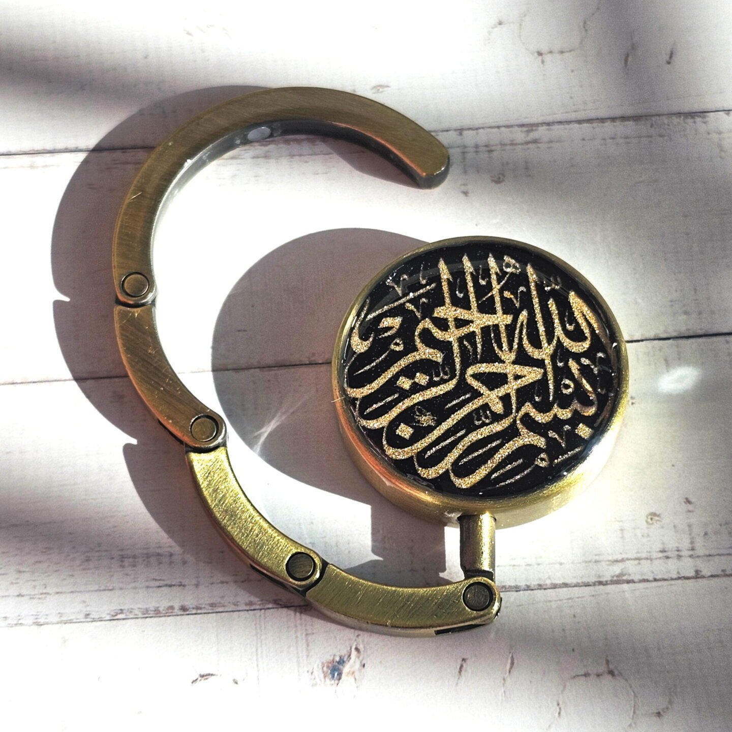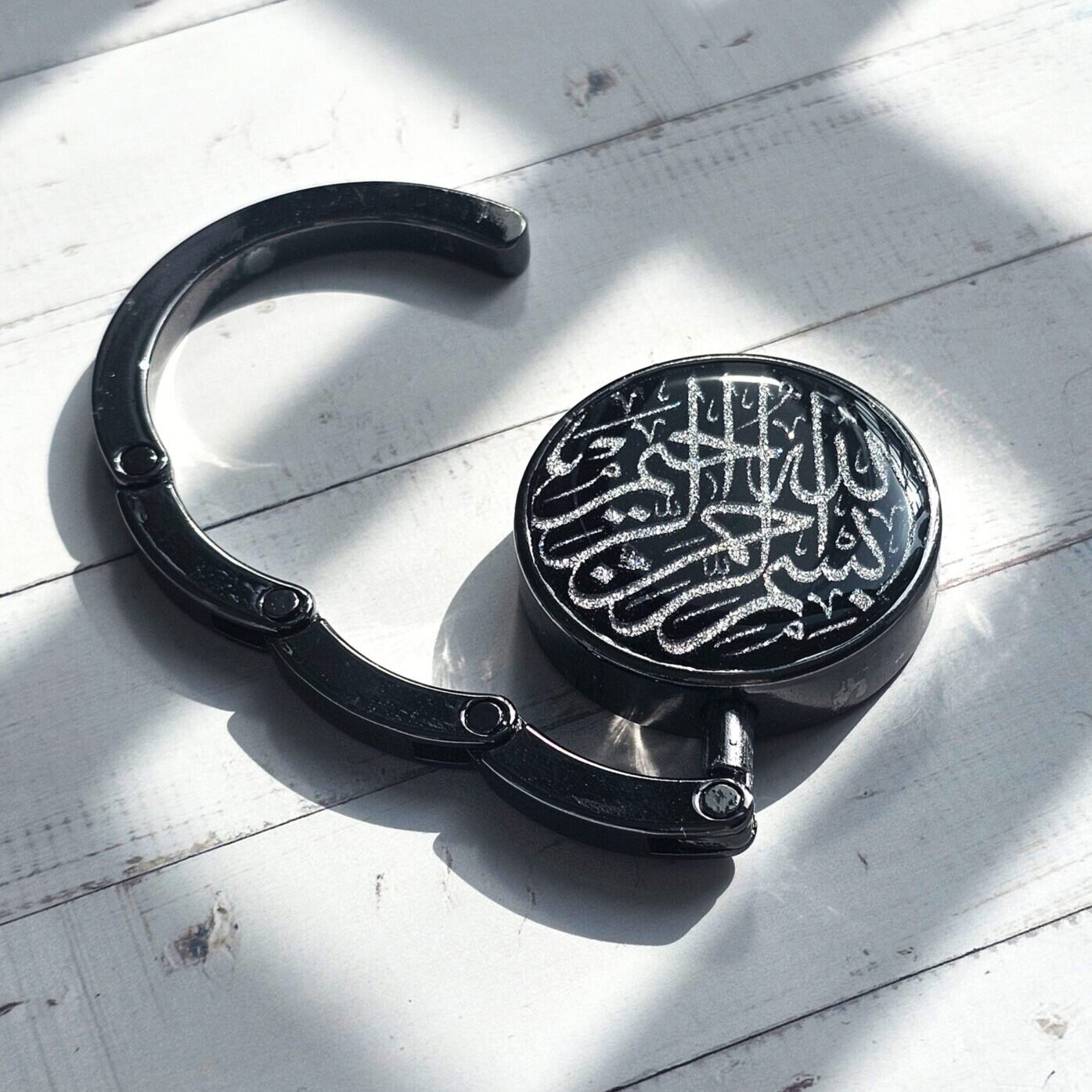 A foldable bag hook designed to keep handbags clean and within reach. Features Bismillah calligraphy meaning In the name of Allah. Ideal for daily use or thoughtful gifting.