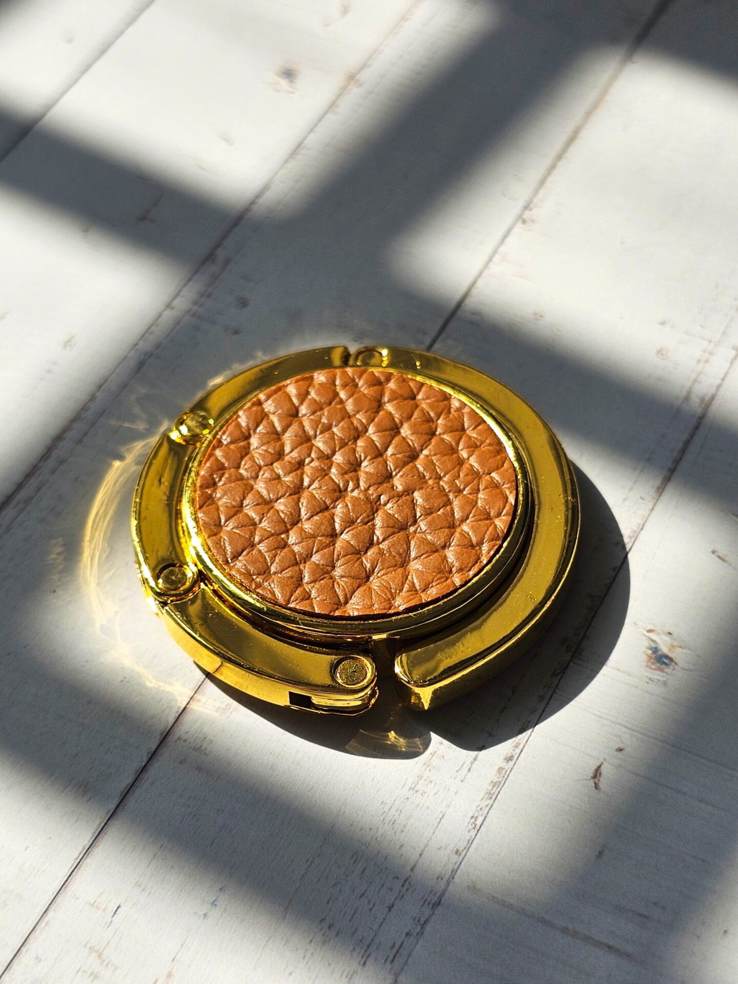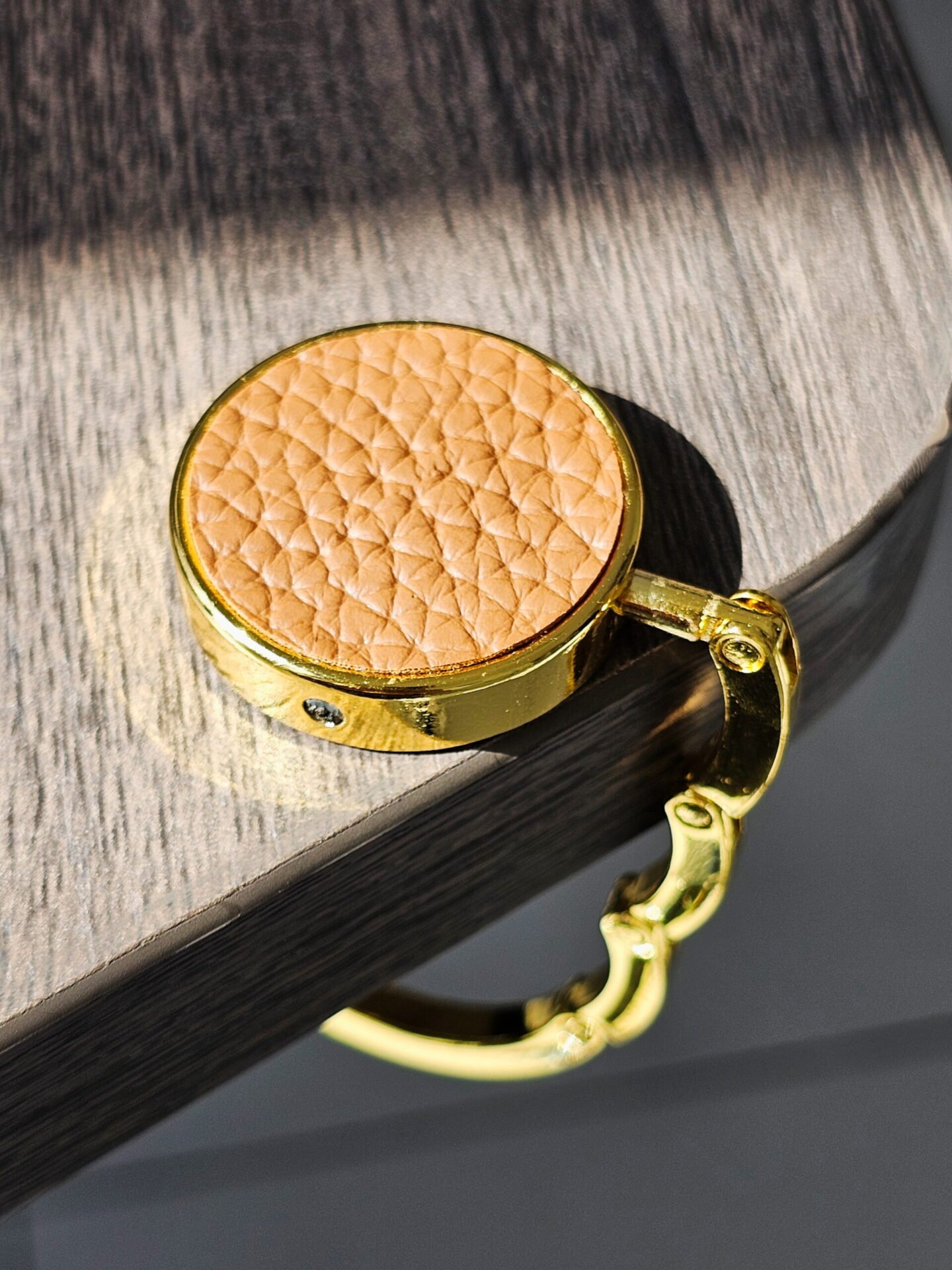 A foldable handbag hook with a PU leather insert, designed to keep your bag secure, elevated, and within easy reach during daily use and dining.