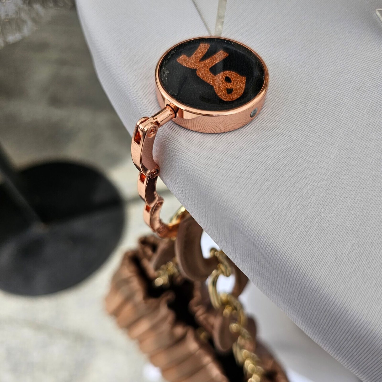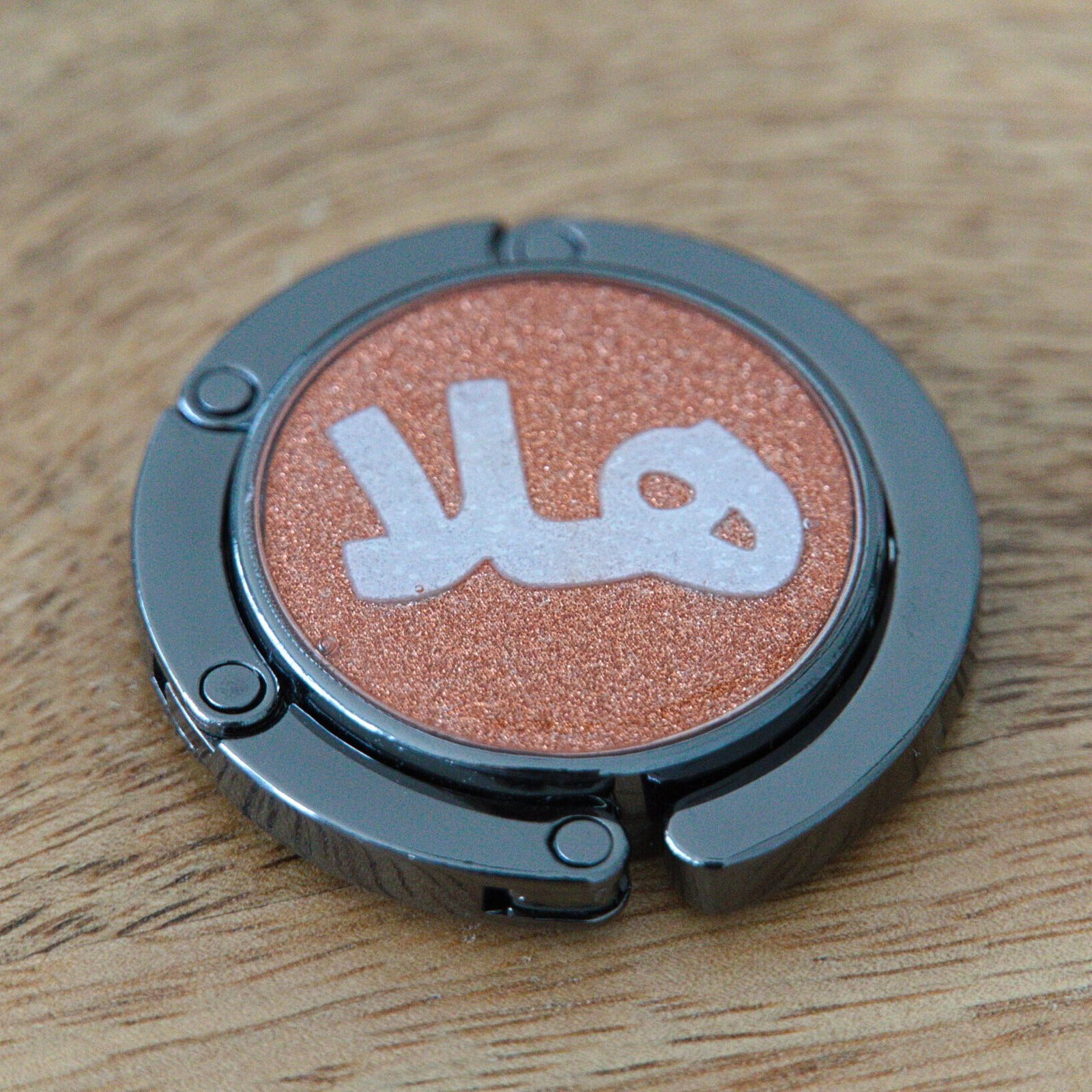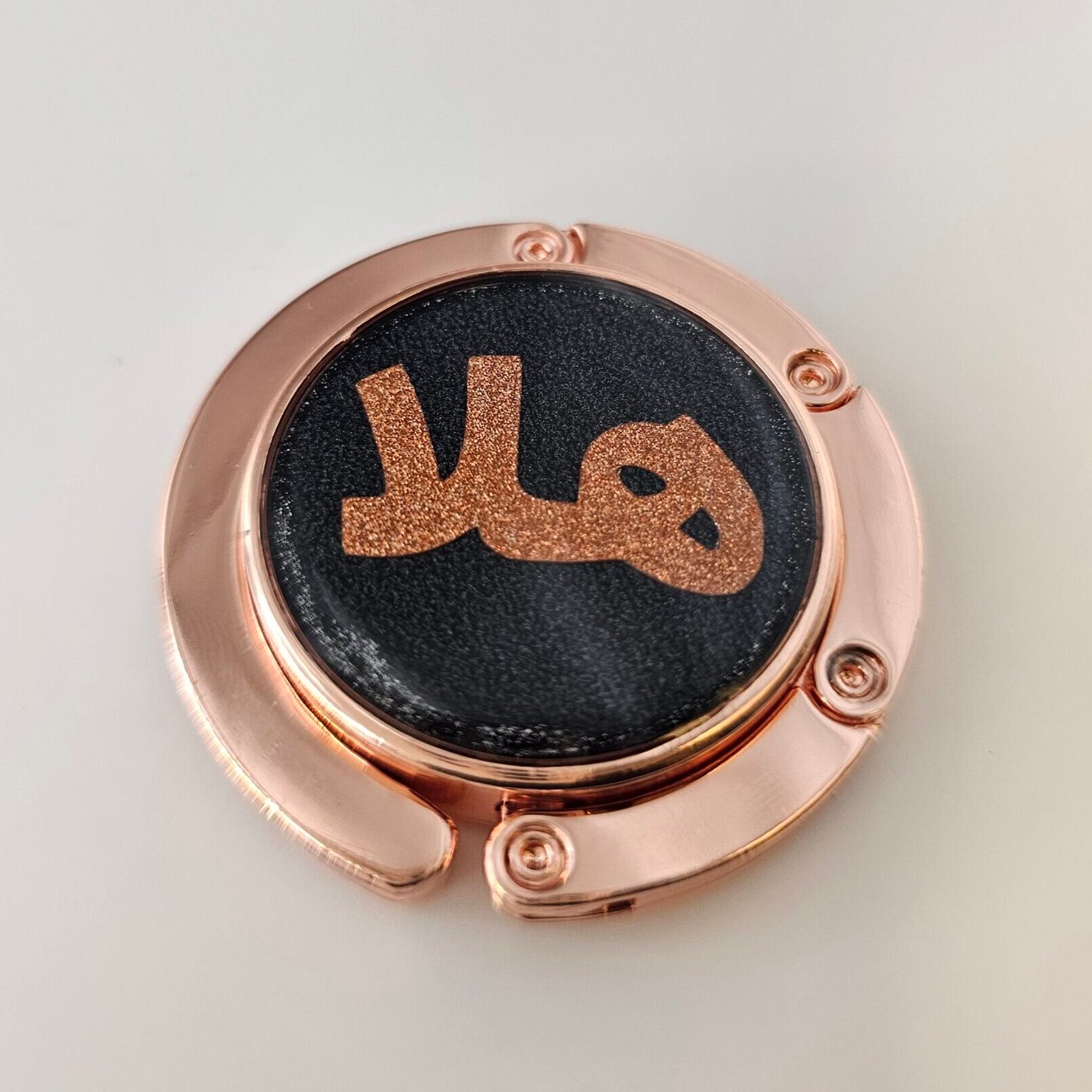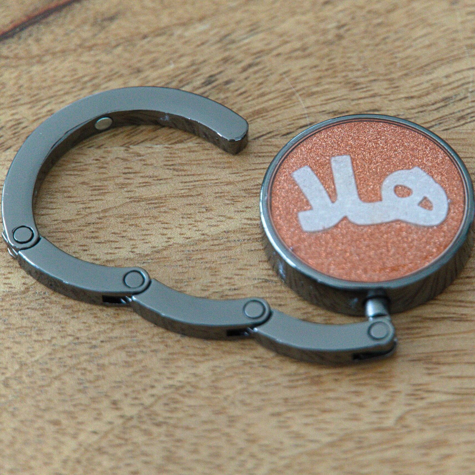 Stylish purse hook in anthracite with Arabic “Hala” design and copper glitter background. Foldable and compact — a unique gift and bag accessory.