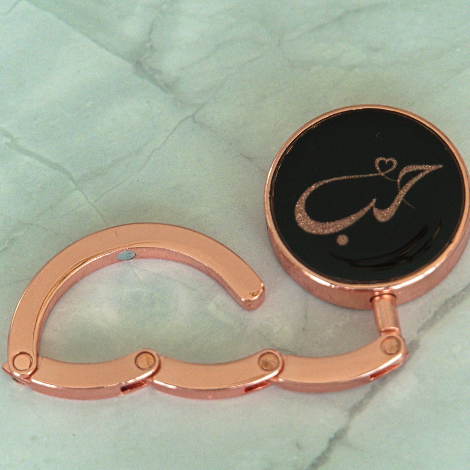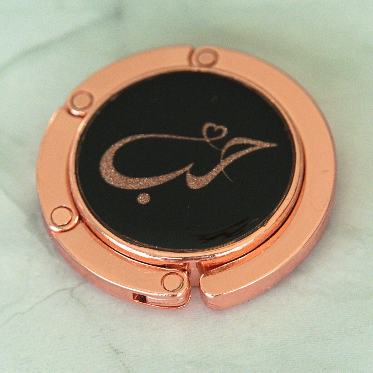 Carry your bag with elegance and meaning. This rose gold purse hook features the Arabic word “حب” (Hob), meaning Love, beautifully written in glittering rose gold on a sleek black background. The delicate heart detail in the calligraphy adds a romantic and refined touch, making it the perfect accessory for daily use or as a thoughtful gift.