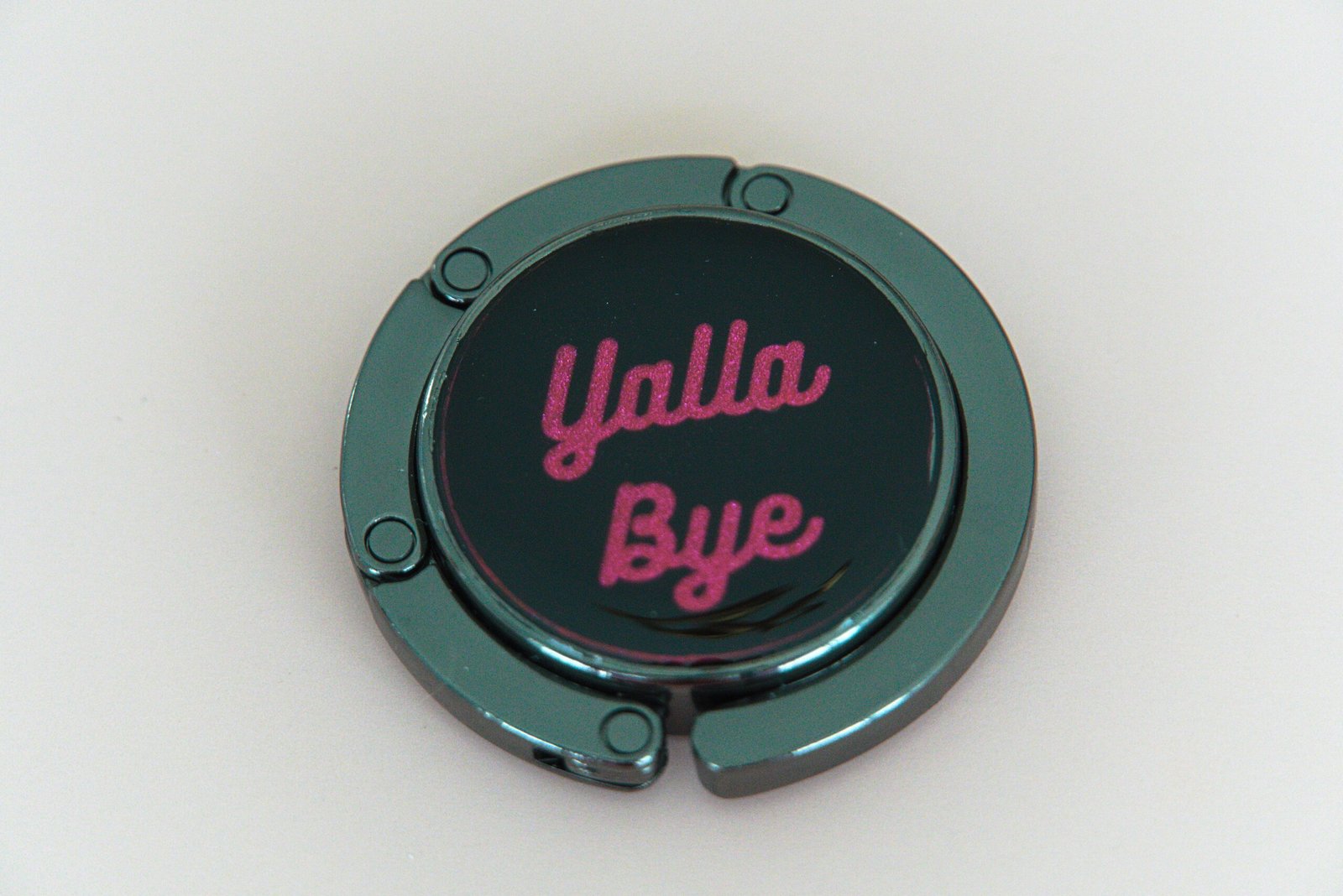 Bring a touch of Dubai sass to your style with this bold purse hook. Featuring the phrase “Yalla Bye” in sparkling pink glitter against a sleek black background, this hook is more than just practical – it’s an attitude.